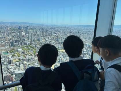 「西には…」「北には…」「南には…」「東には…」子どもたちは目を輝かせ、あべのハルカス展望台から、いろいろなものを見つけていました。自分の住んでいるところ、聖和小学校、京セラドーム、大阪万博の会場…見つけられたかな。