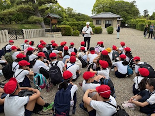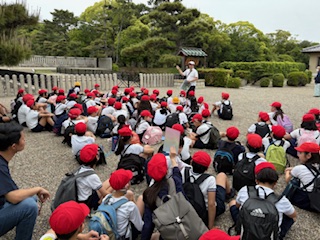 古墳の側面を歩いて正門まで向かいました。校長先生から仁徳天皇についてお話しタイムです!