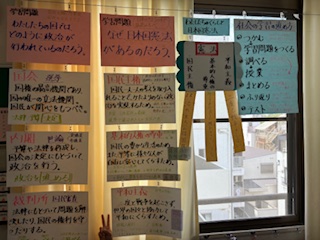 子どもたちは、「立法(国会)」「行政(内閣)」「司法(裁判所)」という三つの権力が、それぞれ独立してバランスをとっていることを知りました。
