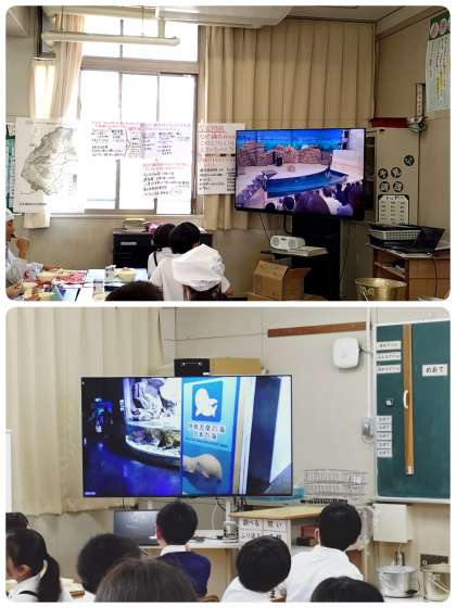 午前中、6年生が修学旅行で鳥羽水族館に行った際の動画を1年生から5年生がみています。