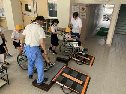 車椅子体験を行いました。子どもたちは車椅子の操作方法を学び、スロープや段差を越える難しさを実感しました。日常生活での困難を実際に体験することで車椅子を使用する方への理解と共感を育むことができました。