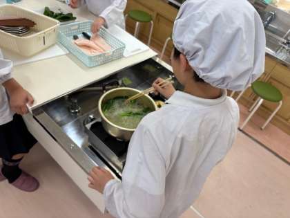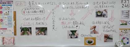 家庭科の時間に、青菜(ほうれんそう)を茹でて「おひたし」を作りました。