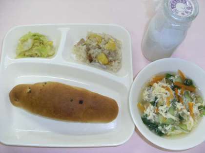 もち米に焼き豚、くり、しいたけを加えて蒸し焼きにしています。チキンスープとごま油でコクをだしている、子どもたちに好評な献立です。
