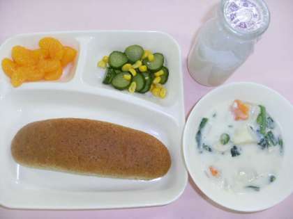 旬のほうれん草を使用した、子どもたちに人気のある献立です。小麦粉とサラダ油でホワイトルウを作り、生クリームでコクをだしています。