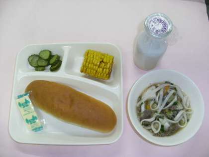 にんじん、はくさい、しめじ、かまぼこ、青ねぎが入ったうどんに、しょうが、砂糖、こいくちしょうゆで味つけした牛肉を加えて煮ます。