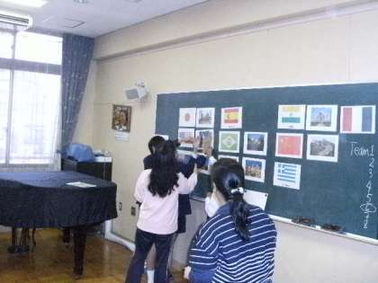 その英語をグループ内で順に伝えていき、該当する国や世界遺産の写真を当てるゲームです。