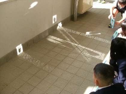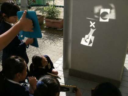 鏡に自分の好きな図形を切り抜いて貼り付けて、反射した日光がどのように映るか、確かめていました。