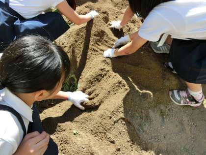 2時間目に2組が、6時間目に1組が一畝ずつ掘ってみると…。