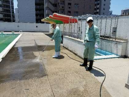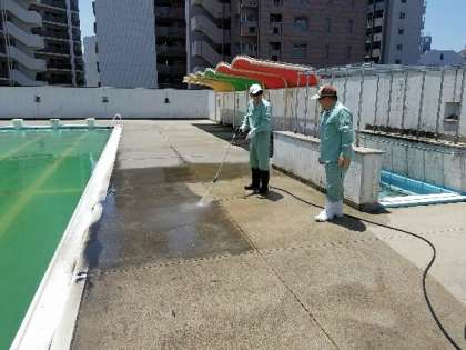 プール開きに向けて、管理作業員さんがプールサイドなどをきれいに掃除してくださっています。シーズンオフの間に汚れたプールサイドが、みるみるきれいになっていきました!