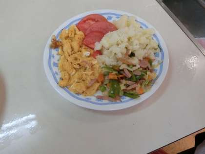 朝食の学習として、スクランブルエッグ、野菜炒めを作りました。