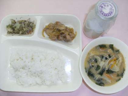給食に新登場の赤じそ(ゆかり)を使った献立です。塩ゆでしたキャベツに、赤じそ、砂糖、うすくちしょうゆで作ったタレをかけ、あえます。