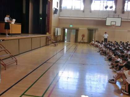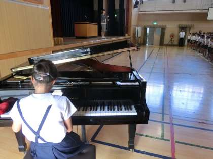 7月20日(水)、第1学期終業式が行われました。はじめに講堂に集まったクラスも式が始まるまで静かに待ち、どのクラスも時間までにゆとりをもって集合完了し、全ての学年が最後まで大変素晴らしい態度で1学期最後の日を終えることができました。代表で校歌のピアノ伴奏をしたり、皆勤賞を授与されたり、1学期の思い出を作文発表したりした子ども達も堂々とそれぞれの役割を果たしていました。保護者の皆様には、この1学期の間も多大なご支援ご理解をいただきましてありがとうございました。