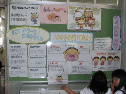 職員室入口の横に掲示板があります。子どもたちの健康に関するものが掲示されています。(作成者は保健室の松岡先生です)
