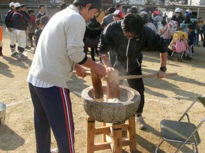 もち米を杵でつぶしてもちにするのが結構大変です。