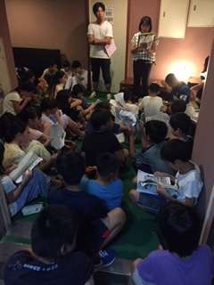 今日の1日の活動を振り返って、明日の予定を確認しました。狭い場所で暑かったけれど、みんなガマンして、真剣に取り組みました。