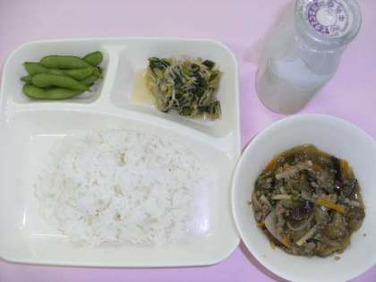 牛挽肉と豚挽肉をしょうが、トウバンジャンで炒め、にんじん、たまねぎ、ピーマン、たけのこと旬のなすを使用した、子どもたちに人気の献立です。