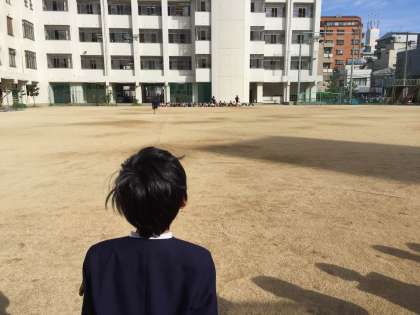 運動場で講堂の奥まで響く声の出し方の練習です。