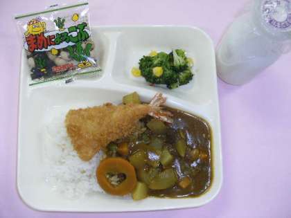 給食室で揚げたえびフライをカレーライスに添えていただきます。