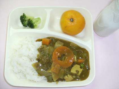 子どもたちに人気のカレーライスに、旬のだいこん、れんこんなどを使用しています。