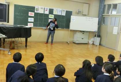 子どもたちはリズムに合わせて問いかけや答え方を練習し、新しく曜日や教科の言葉も覚えることができました。