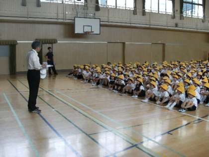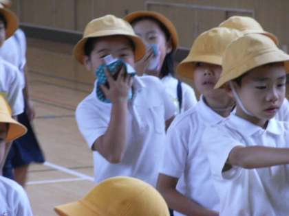 1年生から6年生まで、どの子も緊張感をしっかりもちながら、ハンカチを口にあて整然と避難の訓練ができました。