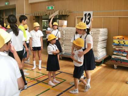 その後は、災害時の下校に備えて地域子ども会の班に分かれて並ぶ練習をしました。