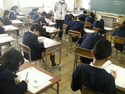 教室前面の掲示物の上から模造紙をはり、不正が行われないようにしています。