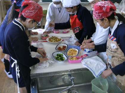 どの班も、皆で協力して弁当作りに挑戦していました。