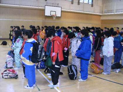 講堂での出発式のあと、色とりどりのスキーウエアに身を包み、2台のバスに分乗して出発しました。
