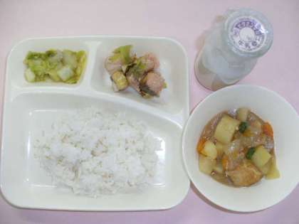 皮なしの角切りのさけとキャベツに、塩、こいくちしょうゆで下味をつけ、溶かしバターをかけて焼き上げます。