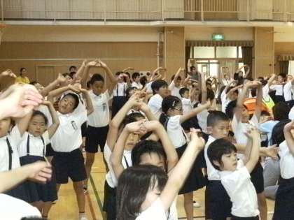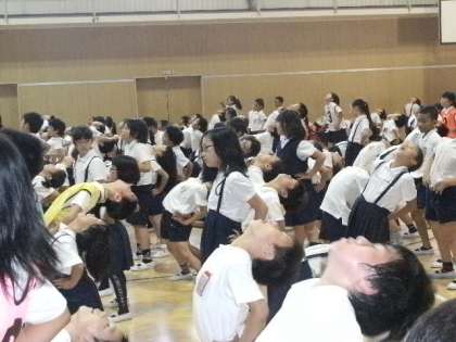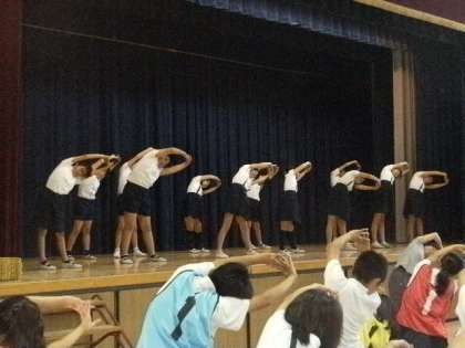 本日の児童集会では、全校生徒380人で「となりのトトロ」の音楽に合わせて「しせいたいそう」を行いました。