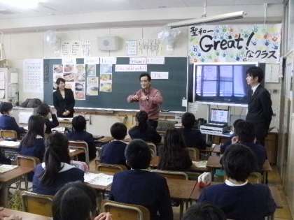 2学期の6年生に続いて、2月10日(月)に、5年生が天王寺中学校の英語の先生から、「外国語活動の時間」の指導をしていただきました。