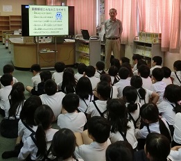 朝の児童集会、今年度初めての縦割り班活動(にこにこ班)では、図書館補助員の川畑先生がみんなに紹介されました。