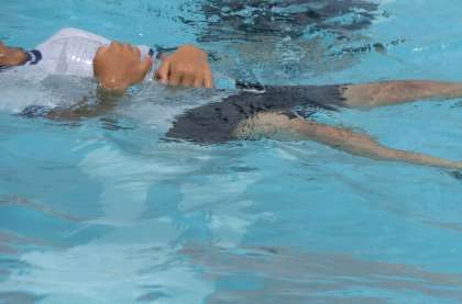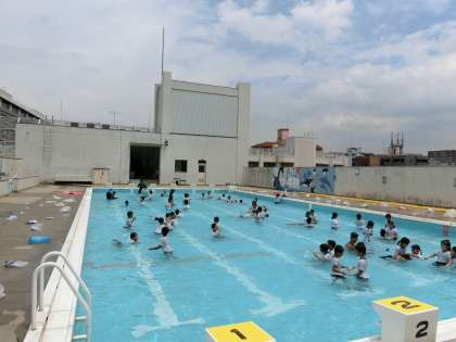 水の事故に備えて、水着での泳ぎに比べ着衣で入水した時の動きにくさを体験しました。着衣だといつものようにプールサイドに上がれず。「重い!」、体操服を脱いだら「軽い!」と実感。