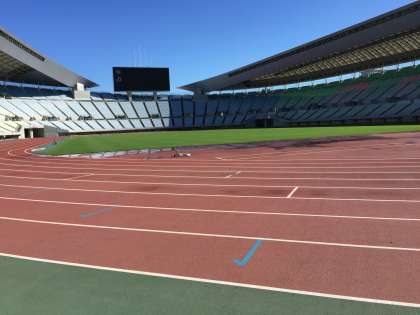 会場に着いて早速アップを始める子どもたち。大きな競技場で思いっきり力を出してほしいです。