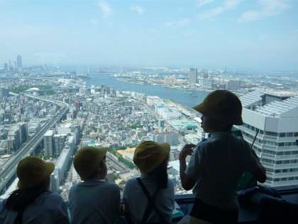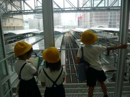 3年生は、社会の学習で大阪市の土地の使われ方を調べます。社会見学では環状線に乗って大阪市を一周し、どの場所にはどんな建物が多いのか、どんな施設が多いのか、電車の窓から見たり、駅や高い建物から観察しました。
