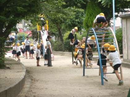 今日のたんけんは少しずつその範囲を広げ、寺田町公園に出かけました。普段、よく遊ぶ公園ですが、わたしたちみんなの公園として、どんな自然があるのか、どんな人が来ているのか、どんな遊具があるのか、話し合いました。
