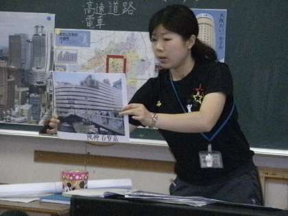 この日は電子黒板いっぱいに映し出されたマップをもとに、ビルが立ち並ぶ大阪市の中央部の土地の使われ方の学習をしていました。