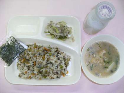 牛肉と10月から登場するごぼうを主材にした、こんぶ(粉末)の旨味をきかせた混ぜごはんです。