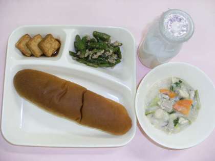 鶏肉とはくさい、チンゲンサイ、生しいたけを使用し、牛乳と生クリームで煮、片栗粉でとろみをつけたクリーム煮です。