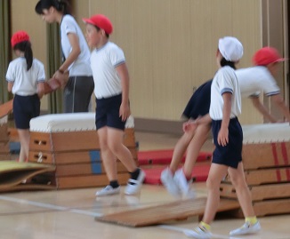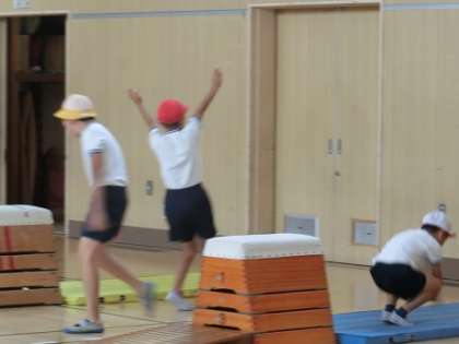 3年生の体育では、今、跳び箱運動をしています。踏切や手の付き方に注意してリズムよく跳んでいます。日頃つかわないところに力が入って突き指したり手首をひねってしまったり・・・。鉄棒、マット、ボール運動など、どの運動もパランスよくして強い体づくりを目指していきます。