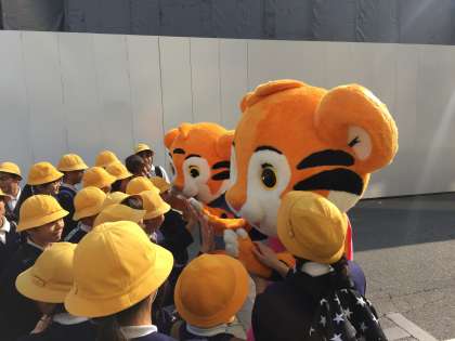 タイガー魔法瓶株式会社に入ると、ティグとティーラのお出迎えで大喜びの子どもたち。