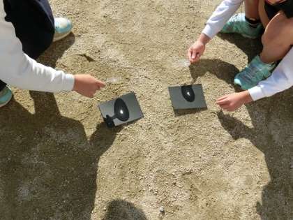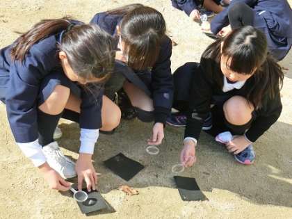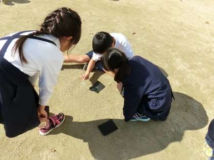理科の学習で、虫眼鏡を使って、黒い紙の上に日光を集めて明るさや温かさを調べる実験をしました。けむりがでるということは・・・きっと相当熱いはず!とちょっとこわごわ、でもその変化はおもしろい。チャイムの音に「もっとやらして〜」コールですた。