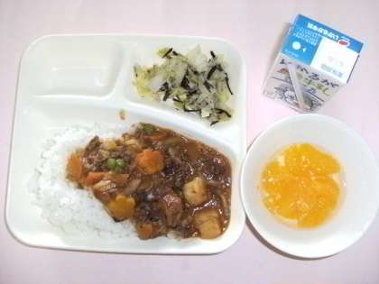小麦粉とサラダ油で作る手作りのブラウンルウとデミグラスソースなどで煮込んだ、子どもたちに人気の献立です。今日はラッキーにんじん(お花やハートなどに型抜きされたにんじん)が入っていました✿