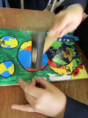 かなづちを使ってくぎうちをしました。やっぱり楽しいことは大好き。ときどき指を強打してしまった子もいましたが、いきいき制作しました。