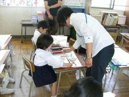 先生の約束のお話を1年生の児童は目を輝かせて聞いていました。