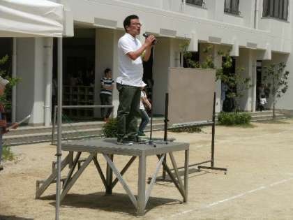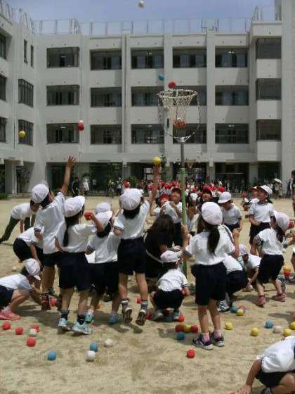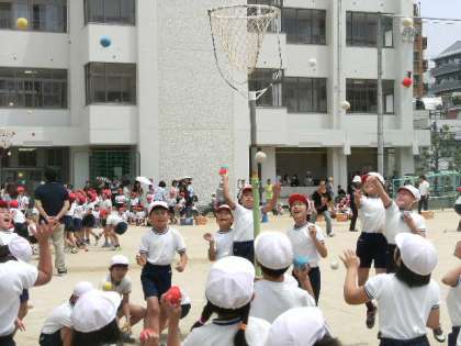 土曜参観の日、爽やかな気候の運動場で今年もPTA主催の玉入れ大会が行われました。