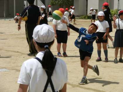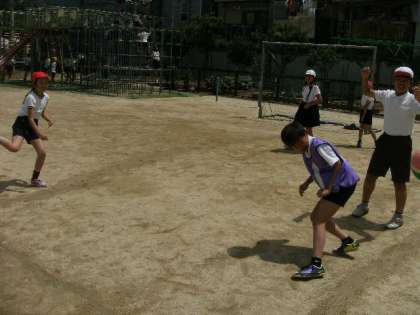 6年生の児童は、下の学年の子らにパスをしてボールを投げさせてあげるなど、思いやりのある場面が見られました。
