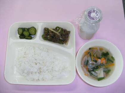牛肉と細切りにしたピーマン、たけのこを使い、オイスターソースの風味をきかせた子どもたちに好評な献立です。