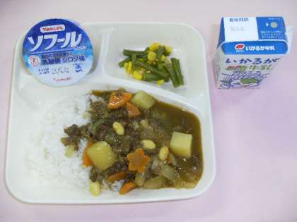 牛肉と大豆のほかに、たまねぎ、にんじん、じゃがいもが入っています。